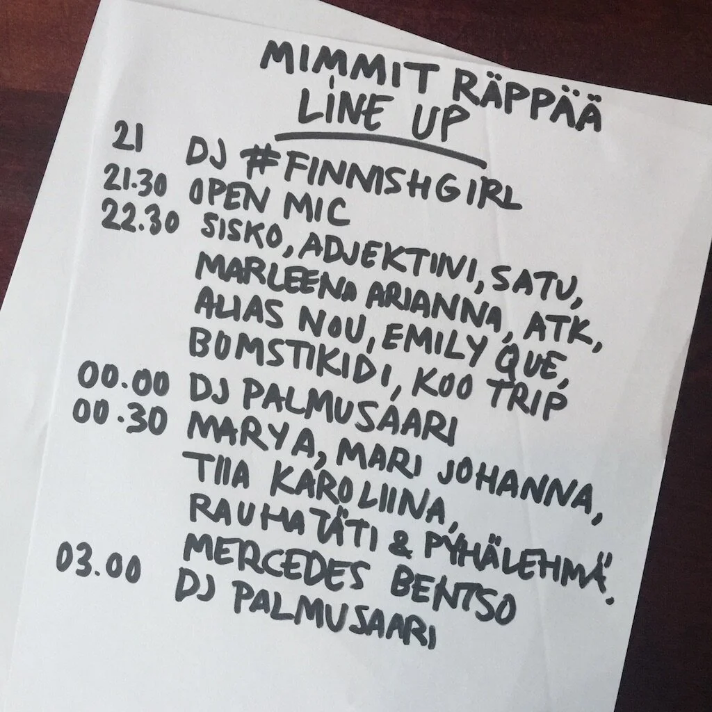 Line up: DJ #Finnishgirl, DJ Palmusaari, Rauhatäti, ATK, Koo Tip, Bomstikidi, Emily Que, Mary A, Adjektiivi, MC Vuorenpeikko, Iiris, Alias Nou, Vaara, Satu, Tiia Karoliina, Marianne Arleena, Sisko | Tuomari: Jontti